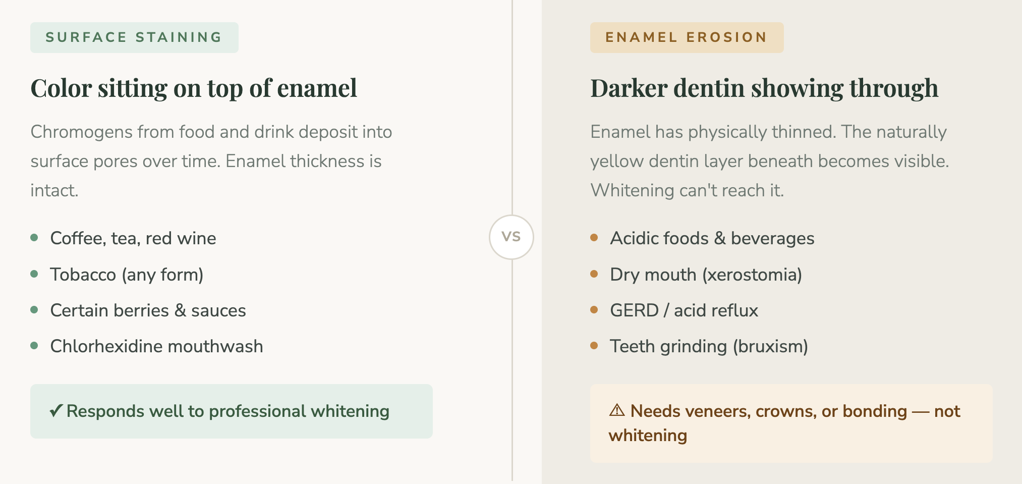 The key distinction: surface staining sits on or just within the outermost layer of enamel. Dentin show-through happens because the enamel itself is physically thinner. One responds to whitening. The other does not.