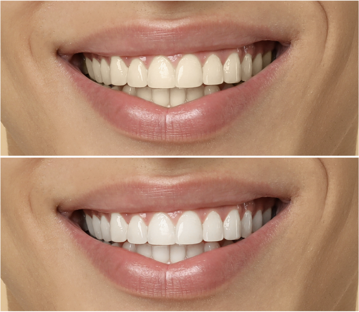 Porcelain Veneers: Thin shells bonded to the front surface. They cover the existing tooth, provide a uniform new color, and protect remaining enamel from further erosion. Ideal when discoloration is internal, enamel is visibly thinned, or shape and color need correction simultaneously.