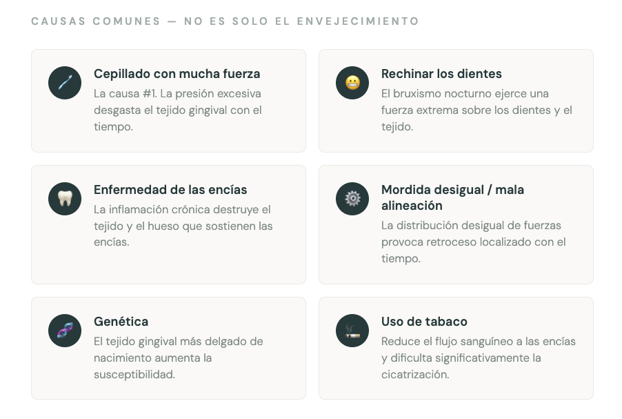 Aquí es donde mucha gente tiene una imagen incorrecta. El retroceso de las encías suele descartarse como una parte inevitable del envejecimiento, pero la edad rara vez es el factor principal. En nuestra clínica, las causas que vemos con más frecuencia son: